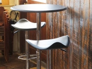 高さ103cmのバーテーブルは、立った状態でも使いやすい高さに天板があり、別売りのバーチェアと組み合わせれば、座った状態でも立っている人と視線を合わせて話すことができます。パーティーなどの立っている人と座っている人の入り混じるようなシーンに適しており、店舗だけでなく、ご自宅にちょっとしたバーカウンターを作ったり、一味違う空間を作ることのできるテーブルです。 特徴的なのが、なんといっても表面に張られた合成皮革(PVCレザー)。スタイリッシュな印象をもたせるほか、機能的にも以下のような長所があります。 ”滑りにくい”レザーが適度な滑り止めになり、グラスやお皿が安定します。 ”音が静か”食器を置いたときに音がしにくいので、静かな場所に適しています。 ”汚れに強い”本革と違い水や汚れがしみこまないので、気兼ねなくお使いいただけます。 裏側までしっかり貼られたレザーは、縁を囲むステッチがデザインのアクセント。 小口(革の断面)は接着されているので剥がれたりほつれたりする心配は無用です。 組み立ては付属の六角レンチ一本で簡単。 台座は大きめな円形。適度な重みもあり、安定しています。クロームメッキ仕上げで錆びにくい仕様となっております。 1本脚のシンプルなデザインだからシルエットが美しく、立ち座りの邪魔になりません。 台座裏には床キズ防止のプラスチックリング。床の細かな凹凸によるガタつきを抑える効果もあります。 同素材のレザー張りカウンターチェアとのセット販売もございますので、お得にそろえたい方はそちらもご覧ください。 |